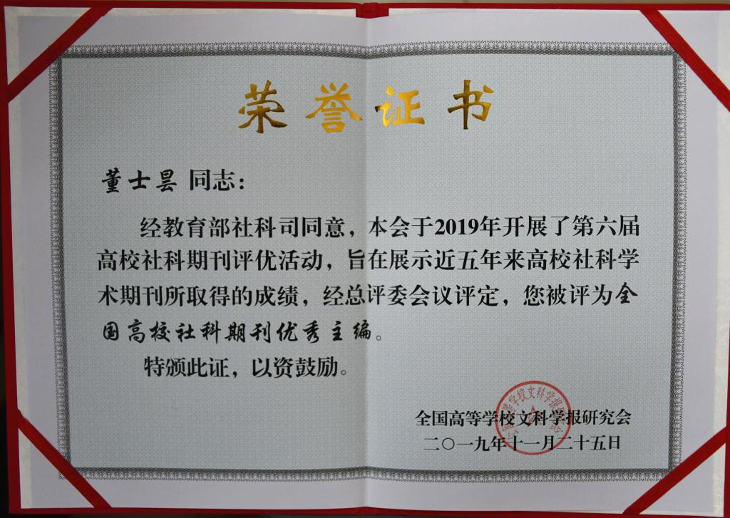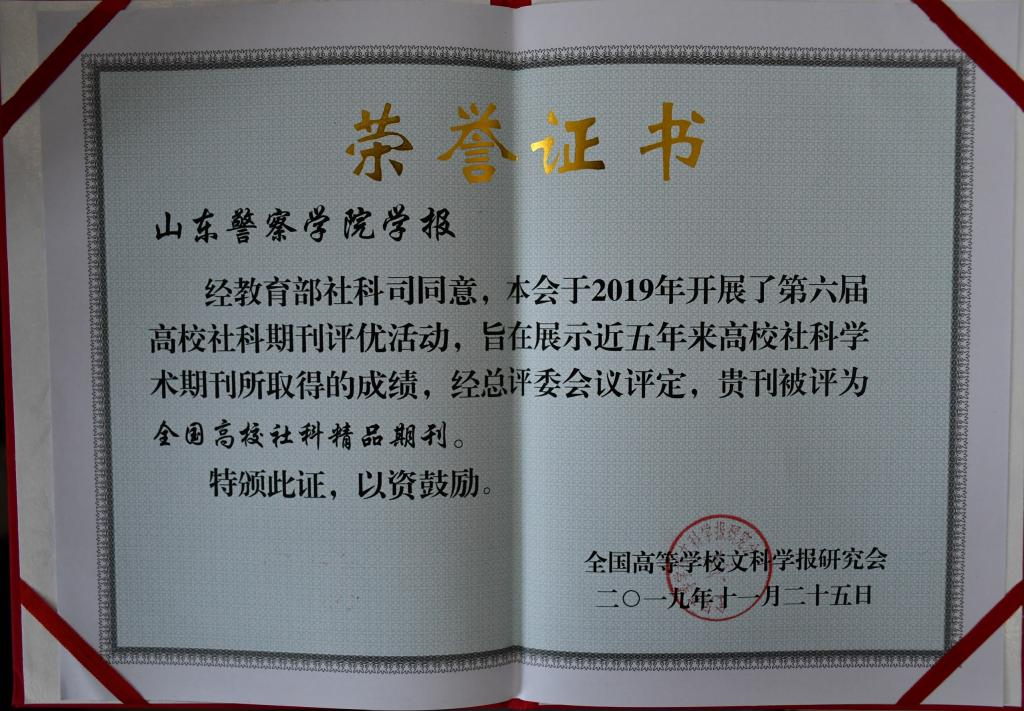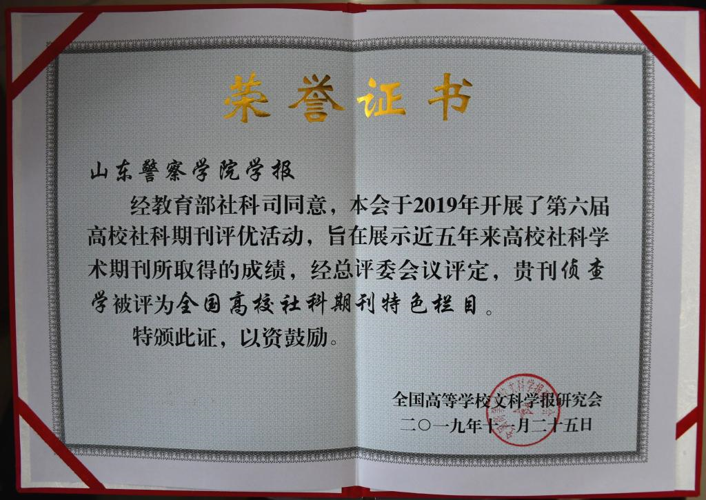 2019年,我院学报被全国高校文科学报研究会评为“全国高校社科精品期刊”、 “侦查学研究”栏目被评为“全国高校社科期刊特色栏目” 、学报编辑部副主任、副主编董士昙荣获“全国高校社科期刊优秀主编”称号。我院学报被评为“全国高校社科精品期刊”,是继2018年我院学报首次进入中国人文社会科学期刊A刊扩展板行列之后的又一次突破。